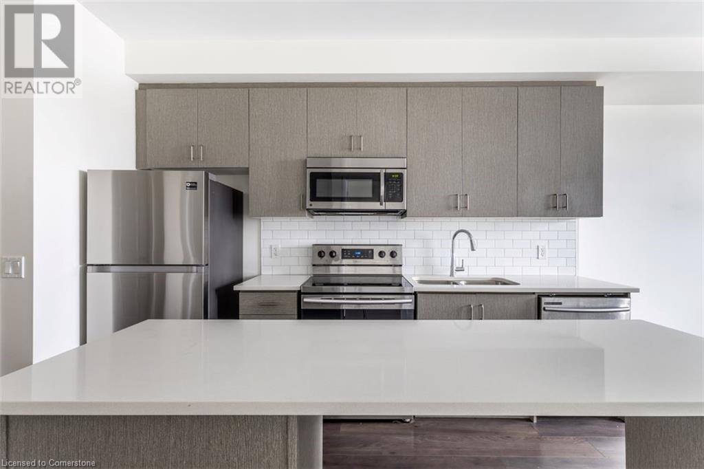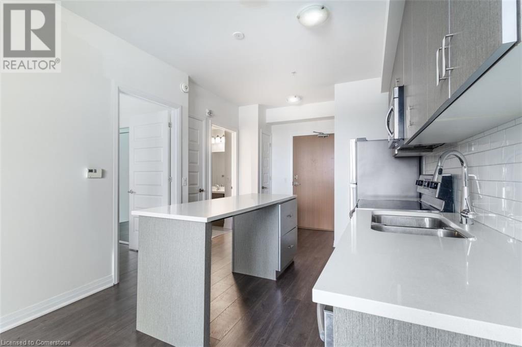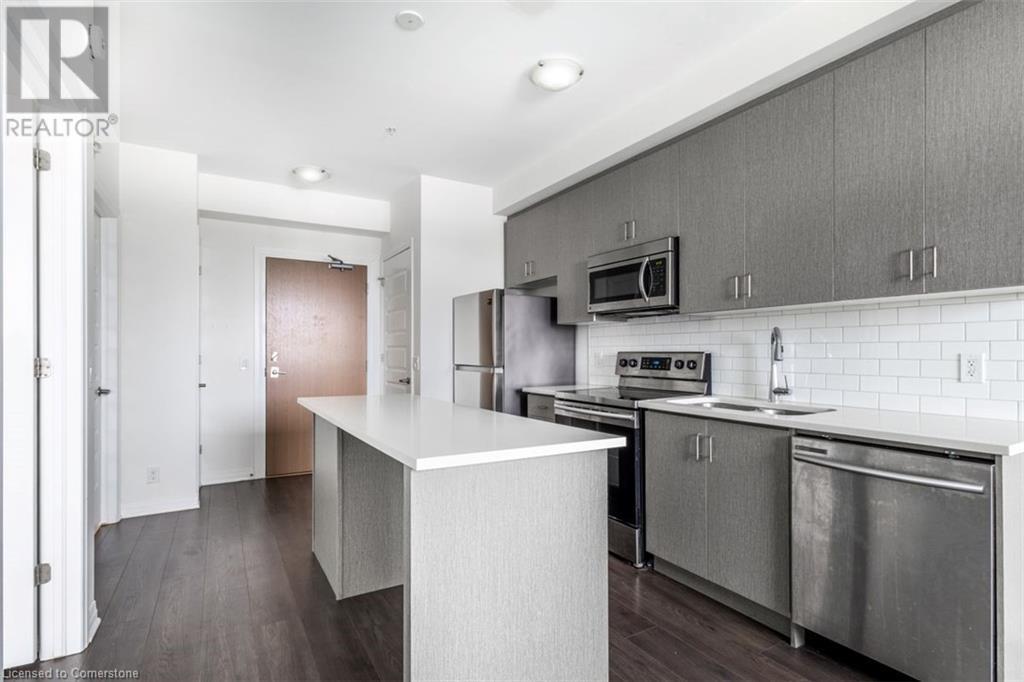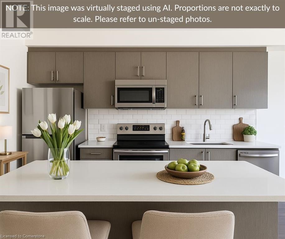 Welcome to Suite 211 at 1105 Leger Way — a stylish 1-bedroom, 1-bathroom condo that blends modern design with urban convenience in the heart of Milton. Step inside to find a sleek, contemporary kitchen featuring stainless steel appliances, quartz countertops, and upgraded oversized island—ideal for casual dining or entertaining guests. The open-concept living and dining area offers a seamless layout perfect for relaxing or hosting family and friends, with natural light flowing in through the large window and glass door that lead to your private balcony. Enjoy morning coffee or evening sunsets overlooking peaceful greenspace and a nearby pond—your outdoor retreat in the city. The suite includes a spa-inspired full bathroom, and the convenience of in-suite laundry. This well-appointed unit also includes one underground parking space and a private storage locker. Ideally located just minutes from vibrant shops, restaurants, trails, and everything Milton has to offer—plus quick access to major highways and transit—this home is a commuter’s dream and urban lifestyle all in one. This suite is vacant and move-in ready with a quick closing. A great space to call your new home! AI-generated virtual staging photos of the suite interior used for inspiration (id:16766)