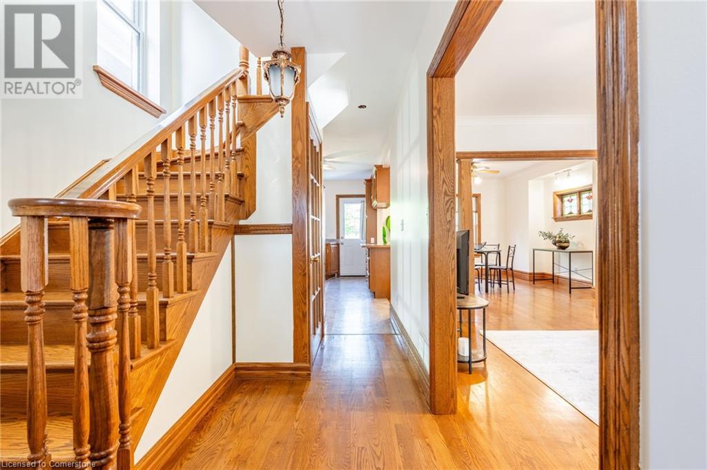 Welcome to Your Next Chapter in Comfort and Charm! Step into this spacious and sun-filled home that perfectly blends original character with modern ease. From the moment you arrive, you'll be captivated by its classic charm, from the beautiful stained glass windows to the rich oak hardwood floors that flow throughout the main level. The open-concept kitchen and dining area, complete with a functional island and full formal dining room, make it perfect for entertaining or cozy family meals. Upstairs, you’ll find two generously sized bedrooms with ample closet space and a large, 4-piece bathroom. The finished loft/attic offers a flexible bonus space ideal as a third bedroom, home office, or creative retreat. A convenient side entrance leads to the partially finished basement, featuring approximately 6-foot ceilings, perfect for storage, hobbies, or future finishing potential. Enjoy morning coffee or evening relaxation surrounded by lush gardens in the tranquil backyard, while the front driveway provides easy, stress-free parking. Located on the quiet side of 'Ottawa St S' with beautiful escarpment views, this home is a peaceful haven just minutes from city amenities. Freshly painted and meticulously maintained, with recent updates to the furnace and central air (approx 2019) simply move in and start enjoying the warmth and character of this truly special home. (id:16766)