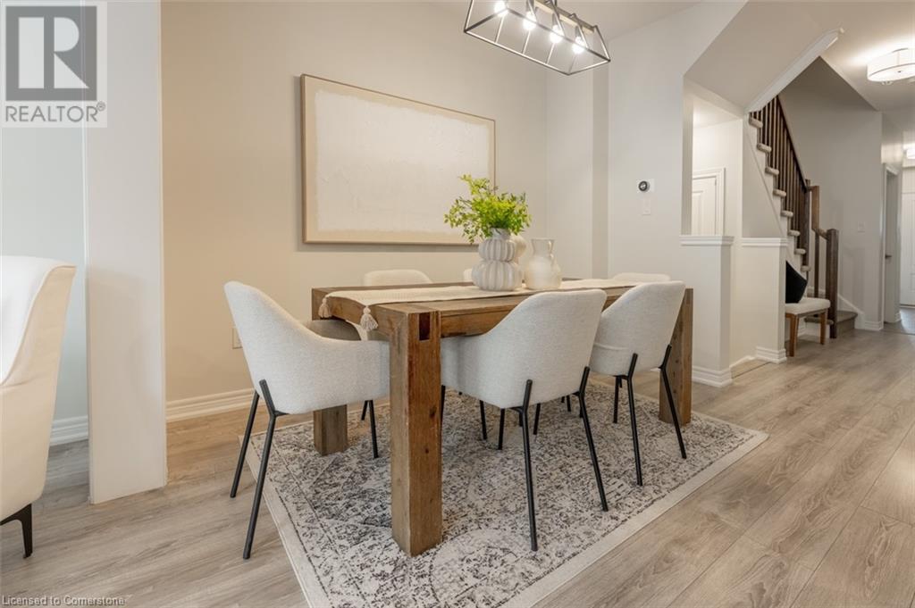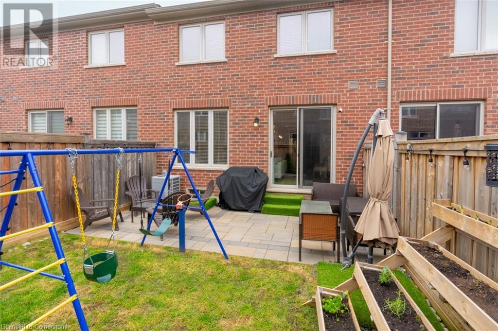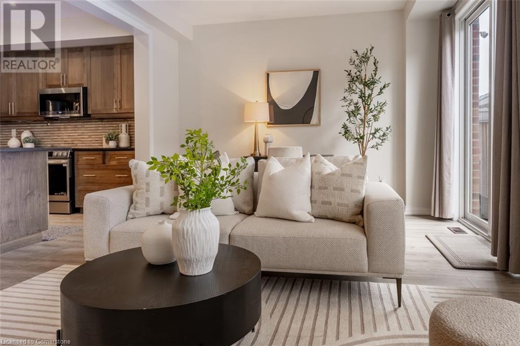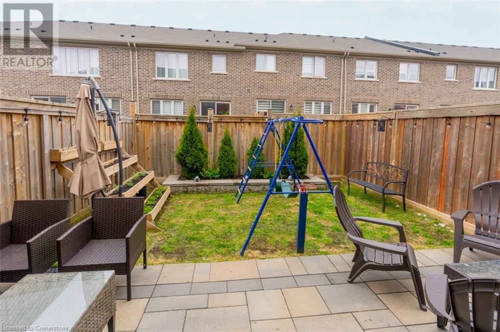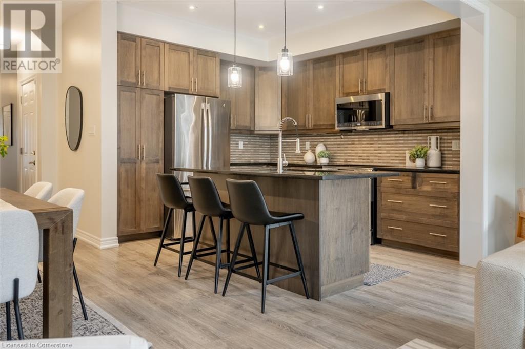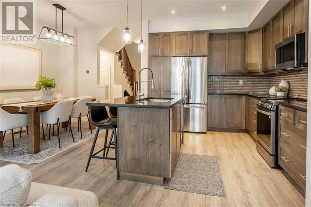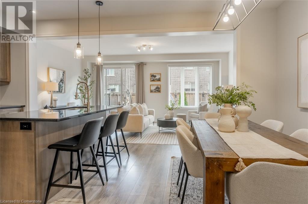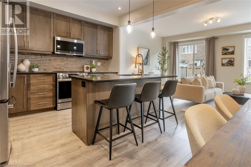 This beautifully maintained Branthaven-built townhome is tucked away in a small collection of premium homes in Milton’s family-focused Ford neighbourhood. From the moment you enter the tiled foyer, you’re welcomed by 9-foot ceilings and a warm, inviting layout. The heart of the home—the kitchen which features granite countertops, pot-and-pan drawers, tall upper cabinets, and extended breakfast bar—flows seamlessly into the spacious living and dining areas, ideal for family meals and weekend entertaining. Upstairs, three generous bedrooms include a bright primary suite with walk-in closet, a second double closet, and a spacious and relaxing ensuite with quartz counters and dual sinks. Enjoy the convenience of upper-level laundry and a fully finished basement complete with a large rec room, 3-piece bath, and wet bar—perfect for movie nights or guests. A fenced yard, covered porch, and nearby parks and schools make this the perfect place to call home. (id:16766)
